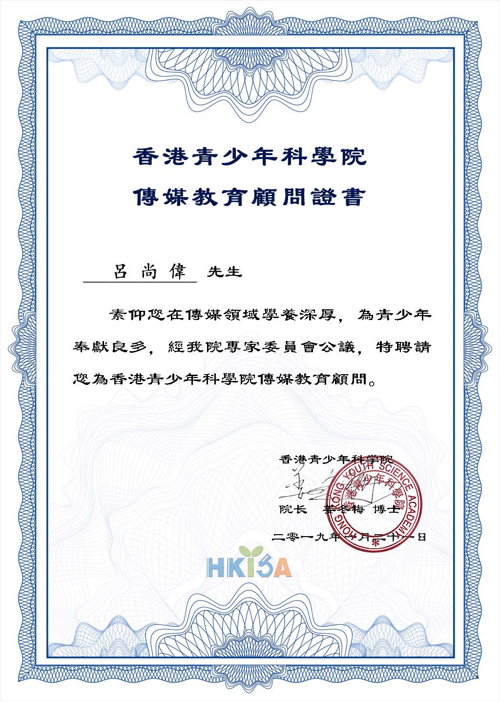 2019年1月21日受邀成为香港青少年科学院传媒教育顾问。