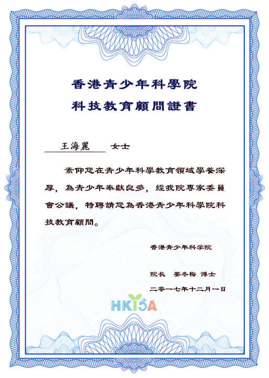 香港青少年科学院科技教育顾问王海丽女士接受顾问证书
