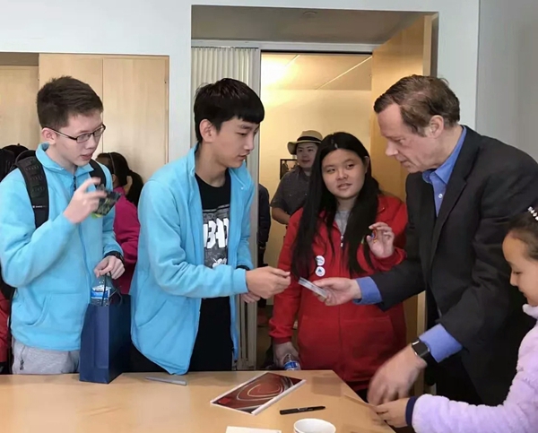 Robert Desimone博士因在科学栏目《最强大脑》中担任最强评委而吸引了众多中国粉丝,大家纷纷上前与他签名、合影。令大家惊喜的,Robert Desimone博士为每位师生准备了一份礼物,引来一阵尖叫!