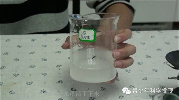 接下来是蔗糖溶液,我配置了浓度为5%、10%、15%、20%、25%、的蔗糖水溶液,出现了与食盐溶液同样的情况,显然,水黾的生存也不受蔗糖溶液的影响。紧接着将4度的白醋稀释,我配置了浓度为0.2%、0.4%、0.6%、0.8%、1%、的4度白醋水溶液,也出现了与食盐溶液同样的情况,我得出结论,水黾的生存不受白醋溶液的影响。