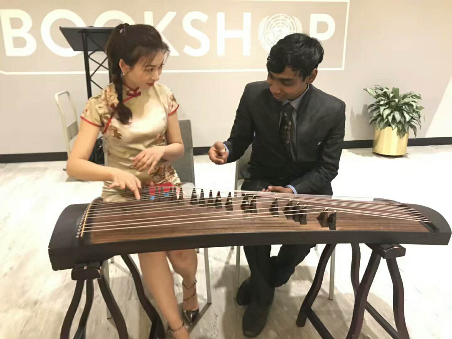 三位美女合奏中国传统乐器,引得洋小伙儿挤过人群,一屁股坐在地上不停拍照。来自印度新德里一所大学的老师一定要跟中国姑娘学习抚琴呢!