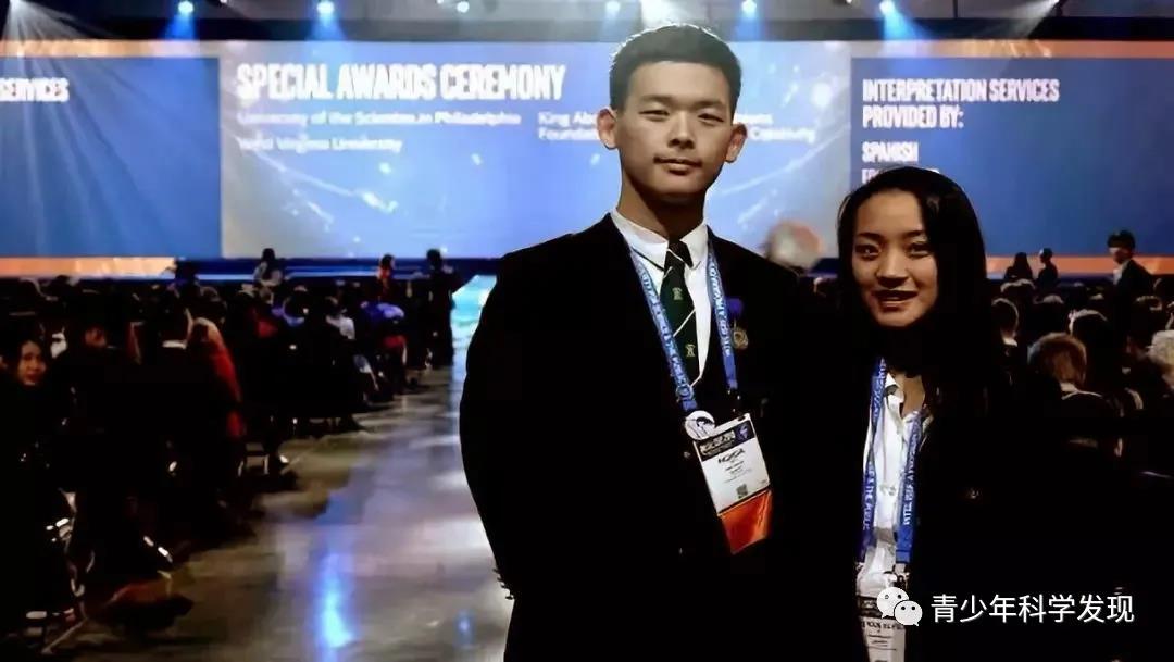 在2018美国匹兹堡第六十九届英特尔国际科学与工程学大赛(Intel ISEF)上,与2008年化学诺贝尔奖得主马丁·查尔菲合影留念。