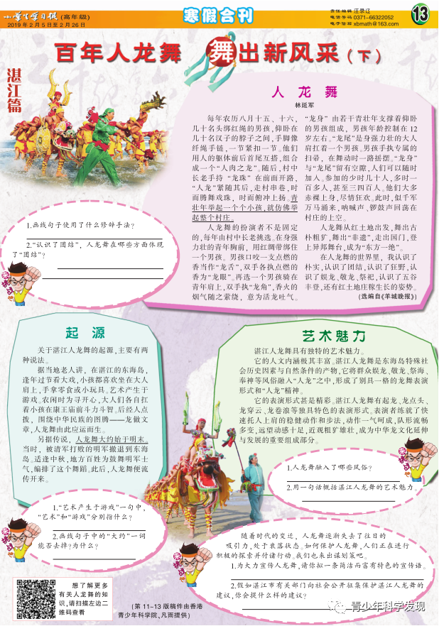 2019年2月在《小学生学习报》刊登的《人龙舞揭秘》↑